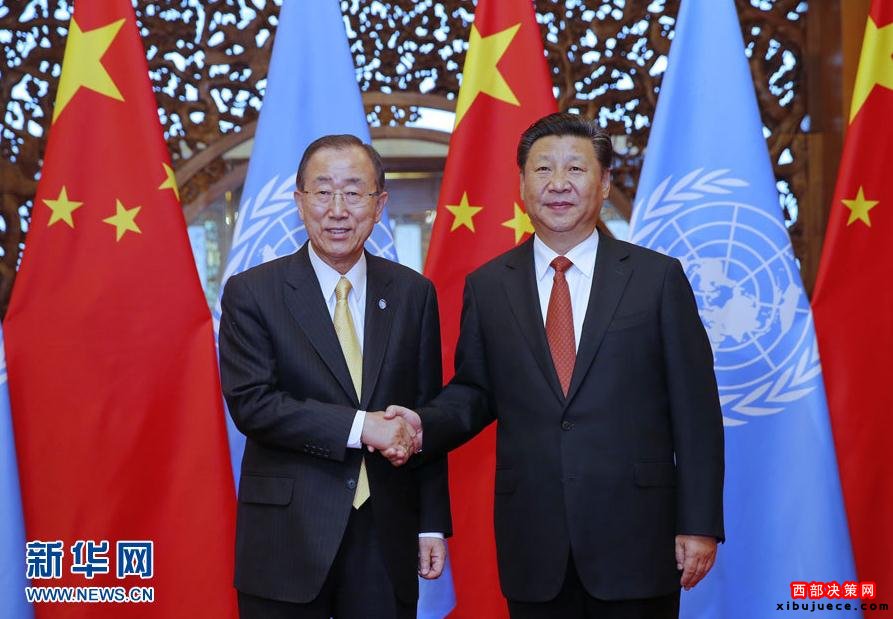 習(xí)近平歡迎潘基文出席9月二十國集團(tuán)領(lǐng)導(dǎo)人杭州峰會(huì)。習(xí)近平指出,中方高度重視并同聯(lián)合國在發(fā)展和氣候變化等問題上開展了密切合作,取得了重要進(jìn)展。中方推動(dòng)二十國集團(tuán)領(lǐng)導(dǎo)人峰會(huì)聚焦發(fā)展問題,推動(dòng)共建“一帶一路”,就是要助力2030年可持續(xù)發(fā)展議程。中方倡導(dǎo)設(shè)立亞投行,并愿同聯(lián)合國、世界銀行等國際組織加強(qiáng)合作,就是要同世界各國分享中國的發(fā)展機(jī)遇。