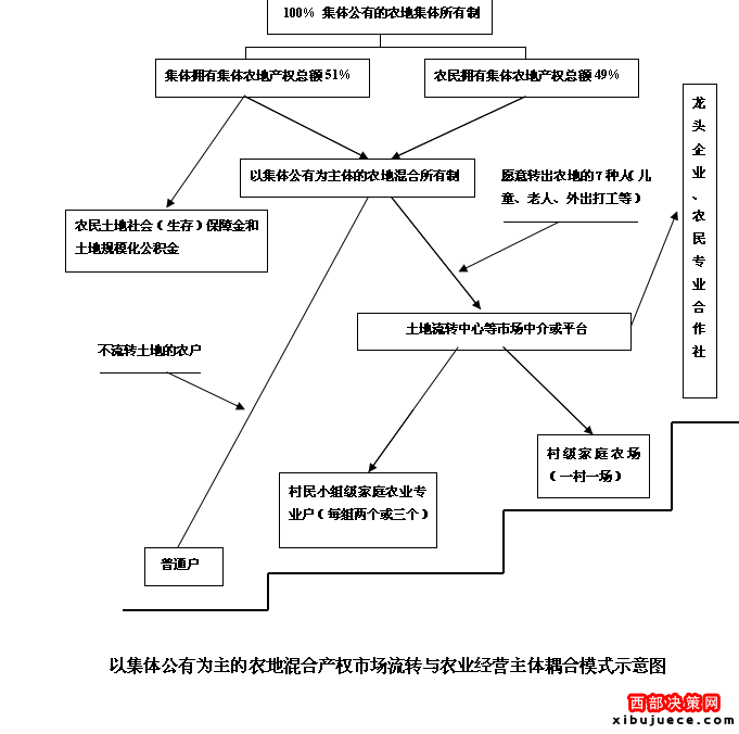 依據(jù)這一《憲法》精神可同理提出“土地以集體公有為主,非集體(農民)所有為輔”的集體土地所有制新形式,從經(jīng)營的角度看,“土地以集體公有為主”用集體土地統(tǒng)一經(jīng)營權來表達,“非集體所有為輔”用農民土地承包經(jīng)營權來表達,從產(chǎn)權數(shù)量上看,讓前者集體占集體土地產(chǎn)權的51%,讓后者農民占集體土地產(chǎn)權的49%(簡稱51:49式土地集體所有制)。由此可見,試驗設計所提出的集體土地所有制新形式與當前農村雙層經(jīng)營體制是完全一致的。