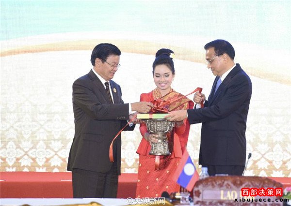 李克強(qiáng)總理7日同東盟10國(guó)領(lǐng)導(dǎo)人在老撾萬(wàn)象共同出席中國(guó)—東盟建立對(duì)話關(guān)系25周年紀(jì)念儀式。觀看紀(jì)錄短片、發(fā)布對(duì)話合作事實(shí)與數(shù)據(jù)手冊(cè)后,李克強(qiáng)與東盟主席國(guó)老撾總理通倫、中國(guó)東盟關(guān)系協(xié)調(diào)國(guó)新加坡總理李顯龍?jiān)谂c會(huì)各國(guó)領(lǐng)導(dǎo)人見(jiàn)證下一起切蛋糕。