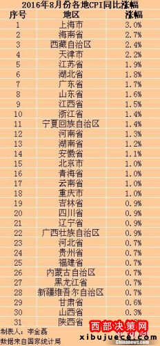 在31個(gè)省份中,上海8月份CPI漲幅全國(guó)最高,為3.0%,漲幅比7月回落0.4個(gè)百分點(diǎn)。數(shù)據(jù)顯示,上海CPI漲幅自今年3月份開(kāi)始已連續(xù)6個(gè)月處于“3時(shí)代”。陜西和山西8月份CPI漲幅僅為0.3%,為全國(guó)最低。