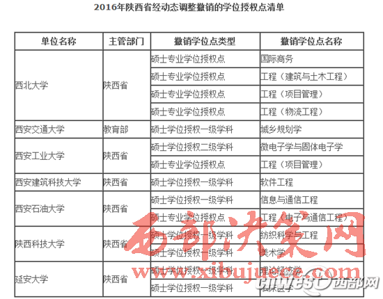 2016年陜西省經(jīng)動(dòng)態(tài)調(diào)整撤銷的學(xué)位授權(quán)點(diǎn)清單包括,西北大學(xué)的國(guó)際商務(wù)、西安交通大學(xué)的城鄉(xiāng)規(guī)劃學(xué)等7所大學(xué)的14個(gè)碩士專業(yè)學(xué)位授權(quán)點(diǎn)和碩士學(xué)位授權(quán)一級(jí)學(xué)科。