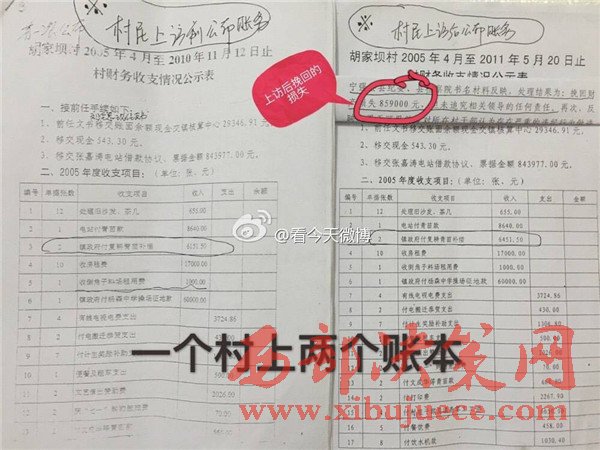 據(jù)實(shí)名舉報材料了解,早在2011年5月16日,經(jīng)群眾上訪,寧強(qiáng)縣縣紀(jì)委、縣檢察院就對黨支部書記劉全忠作出過處理,挽回財(cái)產(chǎn)損失859000元,但并未追究其法律責(zé)任。從胡家壩村公布的賬目來看,村民上訪前和上訪后僅“鎮(zhèn)政府付復(fù)耕青苗補(bǔ)償”單這一款項(xiàng)就有300元的出入。一個村子竟然存在兩本財(cái)政收支賬目,到底哪本賬才是胡家壩村真正的財(cái)政收支賬目呢?為什么要做兩本性質(zhì)相同的賬?會不會該村還有第三本賬?