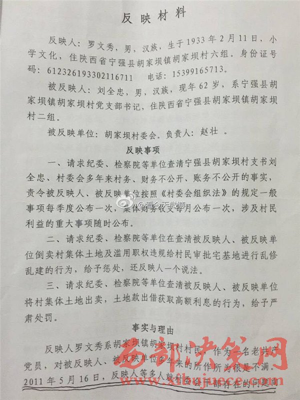 西部決策網(wǎng)訊 近日,有網(wǎng)友微博爆料,陜西省漢中市寧強(qiáng)縣胡家壩鎮(zhèn)胡家壩村,村干部劉全忠利用惠民政策,套取國家大量資金。對于國家扶貧項(xiàng)目,巧立名目、貪污、侵占村民利益。濫用職權(quán)違規(guī)審批宅基地,倒賣村集體土地,并將村上千萬余元出借他人賺取利息,且村務(wù)不公開、賬務(wù)弄虛作假、嚴(yán)重違紀(jì)行為。