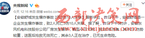 新聞中心官方微博今日消息稱,據(jù)新華社,昨日下午,安徽舒城縣一企業(yè)發(fā)生爆炸事故,致2人死亡3傷10人失聯(lián)。據(jù)了解,昨日下午5時許,安徽東風(fēng)機電科技股份公司廠房發(fā)生爆炸,截至今日10時,救出5名傷者,其中2人傷勢較重,送醫(yī)后搶救無效死亡,其余3人正在治療,已無生命危險。