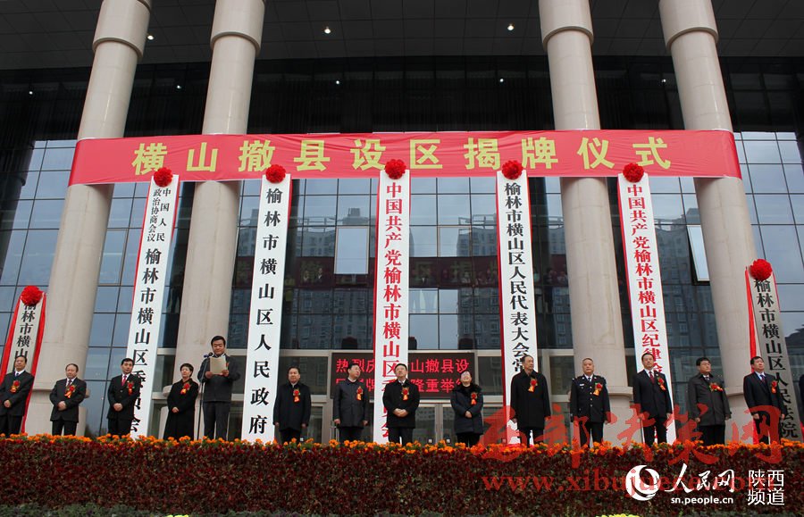 11月9日上午,橫山撤縣設(shè)區(qū)黨政干部大會暨揭牌儀式在橫山舉行。榆林市委書記胡志強,市長尉俊東,市政協(xié)主席劉春橋,陜西省民政廳副廳長郭慧敏等出席掛牌儀式。中國共產(chǎn)黨榆林市橫山區(qū)委員會、榆林市橫山區(qū)人民政府正式掛牌。未來,榆林市行政區(qū)劃將變?yōu)?區(qū)10縣。
