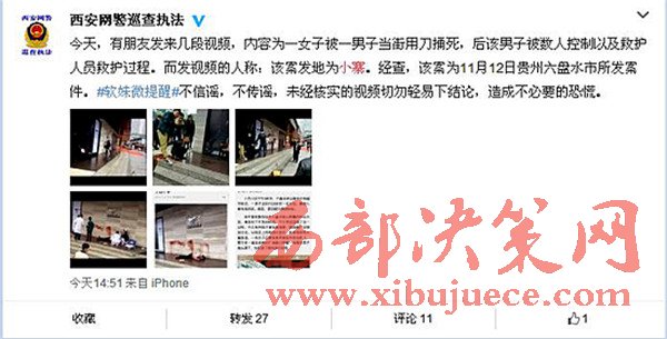 11月14日下午,在許多西安市民的朋友圈傳播幾段視頻,內(nèi)容為一女子被一男子當街用刀捅死,后該男子被數(shù)人控制以及救護人員救護過程。經(jīng)西安網(wǎng)警鑒定,該案件為11月12日發(fā)生在貴州省的案件,并非西安。