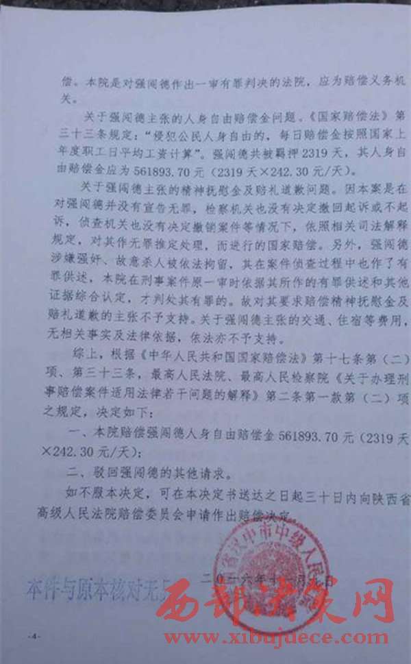 2016年11月9日,陜西省漢中市中級人民法院作出國家賠償決定,國家賠償書上說,根據(jù)《中華人民共和國國家賠償法》的有關(guān)規(guī)定,決定賠償強(qiáng)闖德561893.70元。(強(qiáng)闖德共被羈押2319天,每天按242.30元賠償)。而對于強(qiáng)闖德提出的交通、住宿等費(fèi)用,以及精神賠償?shù)纫?,不予支持?/span>