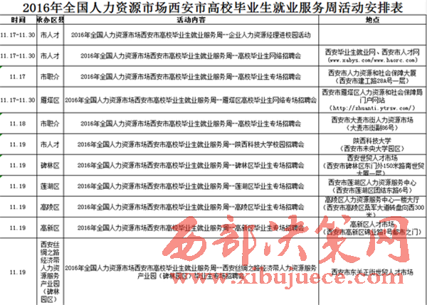 11月17日—11月30日,西安市將舉行2016年全國人力資源市場西安市高校畢業(yè)生就業(yè)服務(wù)周。期間將舉辦高校畢業(yè)生網(wǎng)絡(luò)招聘大會、現(xiàn)場招聘會、人力資源服務(wù)產(chǎn)業(yè)園專場招聘活動等29場招聘會,幫助高校畢業(yè)生找到滿意工作。