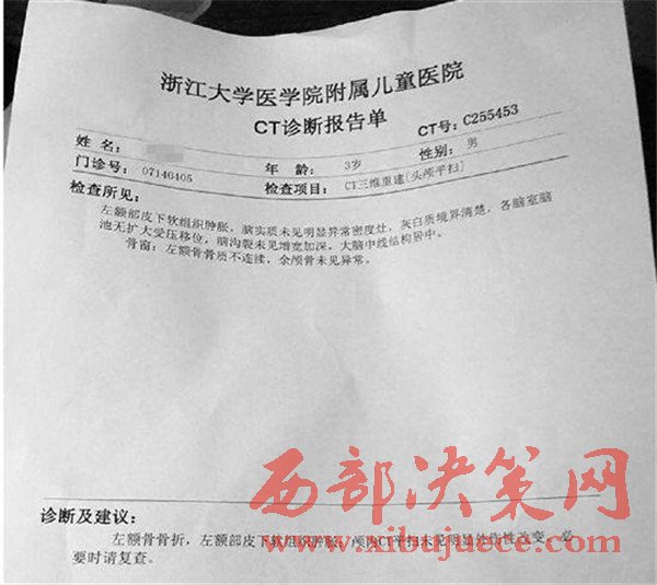為了確認(rèn)孩子的傷情,我和幼兒園的園長(zhǎng)帶著孩子到了杭州的一家醫(yī)院進(jìn)行檢查,檢查結(jié)果顯示孩子臉部骨折。