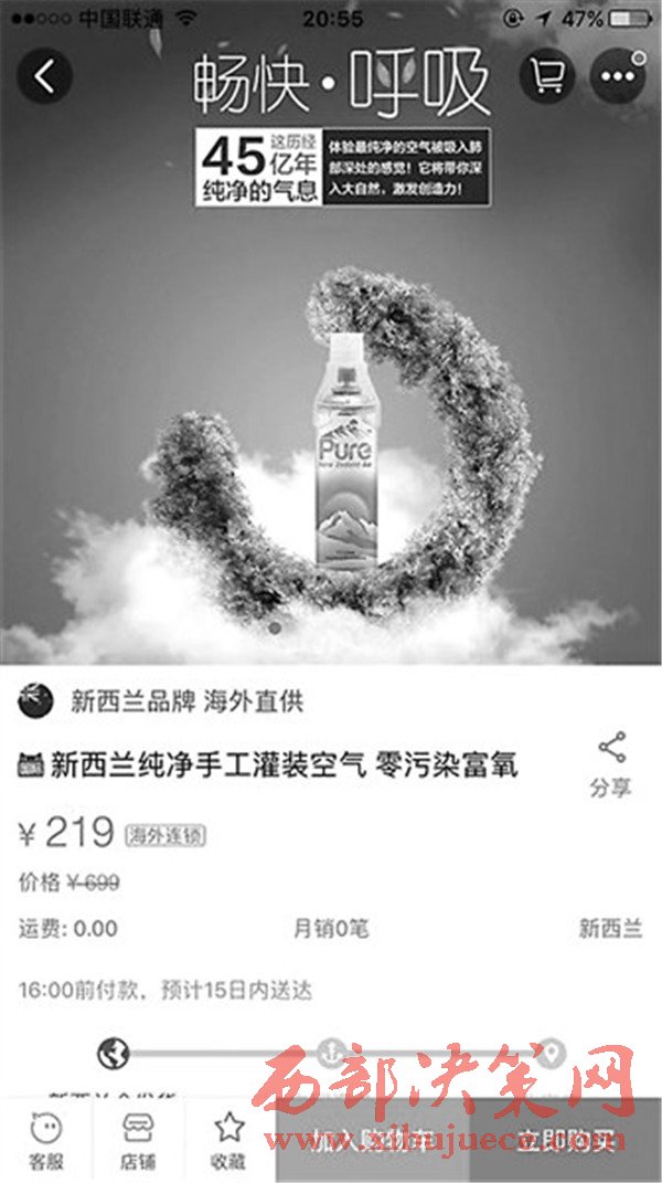 那么“空氣”到底屬于什么產(chǎn)品類別呢?“新西蘭純凈手工灌裝空氣”店主表示,有倉庫在新西蘭,但被問及有無商標(biāo)時(shí),店主只表示是“新西蘭原裝進(jìn)口”,而在進(jìn)口的時(shí)候是以什么類別進(jìn)口的呢?店主表示“不清楚。”