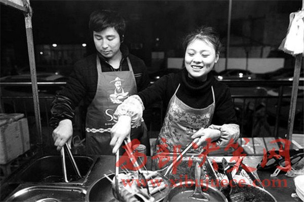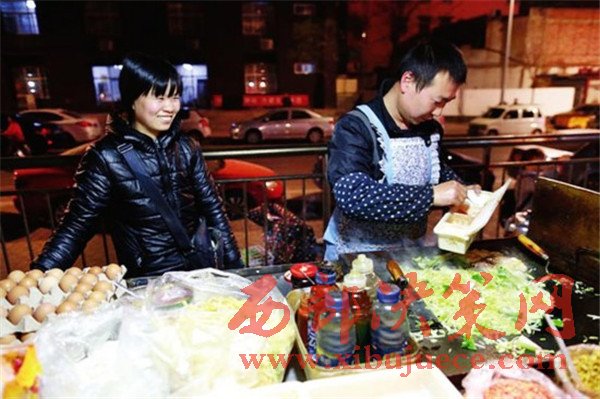 同樣是炒面,河南的楊氏夫婦賣的則是“鐵板炒”,在這個夜市攤干了近4年,每天倆人同出同進(jìn),朝夕相處,“有老婆在身邊,干活兒更有動力,做生意也更和諧,更溫情。”