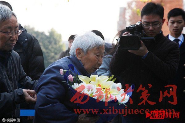 12月9日,江蘇省南京市,南京大屠殺幸存者楊翠英老人向罹難親人敬獻(xiàn)鮮花。