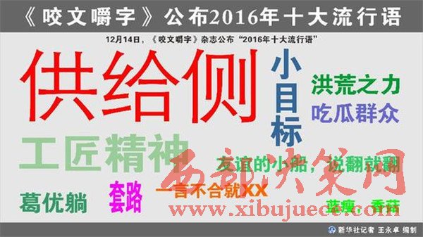 素有“語林啄木鳥”之稱的《咬文嚼字》雜志14日公布“2016年十大流行語”。“供給側(cè)”“工匠精神”“洪荒之力”等詞語上榜。