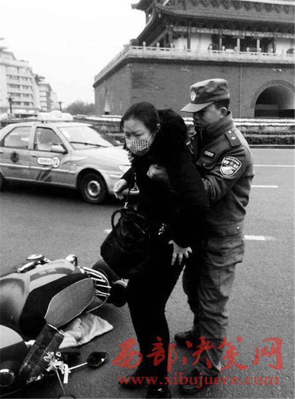 昨天17時(shí)10分,碑林區(qū)城市管理局柏樹林中隊(duì)執(zhí)法隊(duì)員馬奔和張翼在鐘樓開元商城區(qū)域正常開展巡查時(shí),突然看見(jiàn)一名中年女子騎著電動(dòng)車路過(guò)鐘樓十字右拐過(guò)程中,被一輛轎車撞了一下,緊接著,騎車的中年女子連人帶車倒在地上,肇事車輛當(dāng)場(chǎng)逃逸。