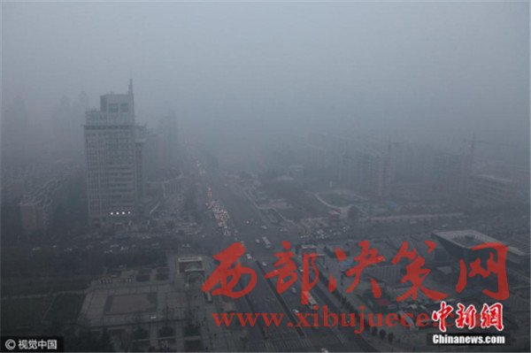 2016年12月19日,鳥瞰西安城市,霧霾籠罩,不太遠的建筑也幾乎被霧霾“吞噬”,看不到一點影,當日早八點,空氣質量指數達409,為嚴重污染。 圖片來源:視覺中國