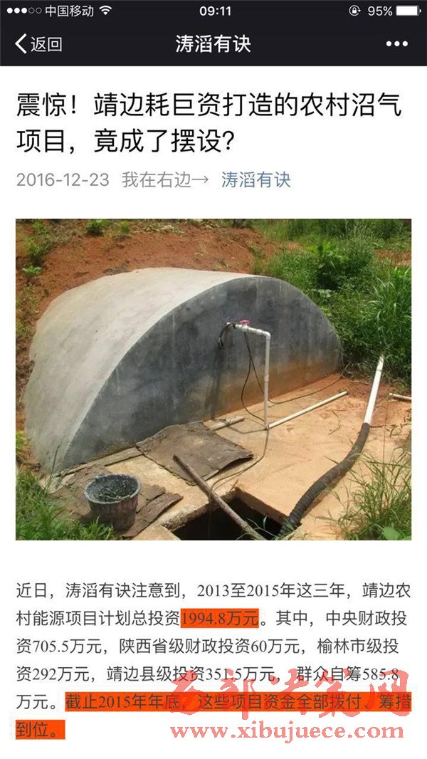 雖然靖邊縣審計局的審計報告,語言高度凝練,也沒給出相應的案例和圖片證明,但很顯然,近三年以來,靖邊縣能源辦手持巨額撥款,全力推進的農(nóng)村沼氣工程,在今年春天就變成了“利用率低、廢棄率高”的擺設。如果是這樣的話,投入再多的財力人力,又有什么意義呢?