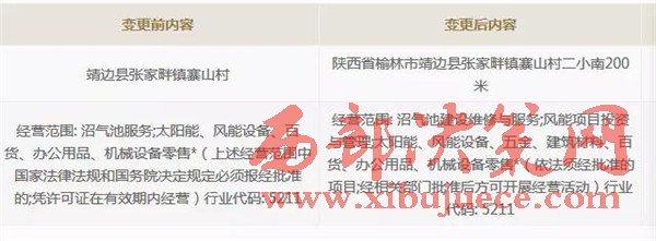 蹊蹺的是,一年半之后的2015年3月18日,靖邊興發(fā)公司突然變更了業(yè)務范圍。將原來的"沼氣池服務”,增加了四個關(guān)鍵字“建設維修”,最終變更成了“沼氣池建設維修與服務”。