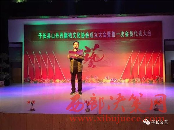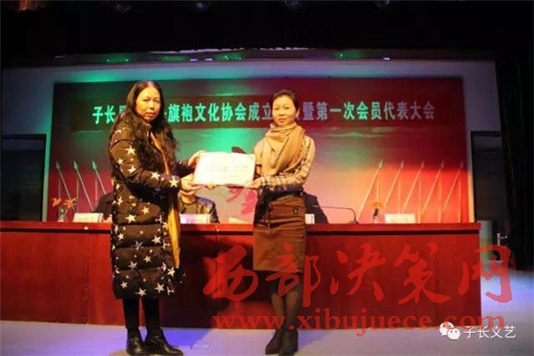 在會(huì)上,山丹丹旗袍文化協(xié)會(huì)的負(fù)責(zé)人白潔做了協(xié)會(huì)前期籌備工作的簡(jiǎn)述,文廣局副局長(zhǎng)宣讀了同意子長(zhǎng)縣山丹丹旗袍文化協(xié)會(huì)成立的批復(fù);民政局副局長(zhǎng)趙和平頒發(fā)社會(huì)團(tuán)體登記證。會(huì)中還進(jìn)行了對(duì)協(xié)會(huì)的理事會(huì),監(jiān)事會(huì),主席團(tuán)成員的選舉。當(dāng)選為協(xié)會(huì)主席的白潔在會(huì)上做了表態(tài)發(fā)言,并代表協(xié)會(huì)向協(xié)會(huì)的顧問(wèn)李建中、王明如,名譽(yù)主席王晶、張琴頒發(fā)了聘書(shū)。最后,協(xié)會(huì)會(huì)員還為觀(guān)眾們準(zhǔn)備了一道文藝表演的盛宴,大會(huì)在星光大道歌手孫秸的一曲《山丹丹開(kāi)花紅艷艷》中勝利中閉幕。