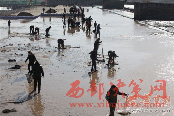 12月27日上午,咸陽(yáng)湖放水剛結(jié)束,渭城橋下瞬間就變成了漁場(chǎng),數(shù)百人在橡膠壩附近撿魚(yú)捕魚(yú),有人甚至不顧危險(xiǎn)跑到淤泥里去撈魚(yú)。咸陽(yáng)湖管理處工作人員提醒,湖底淤泥情況不明,市民切勿涉險(xiǎn)下湖撈魚(yú),以免發(fā)生不測(cè)。