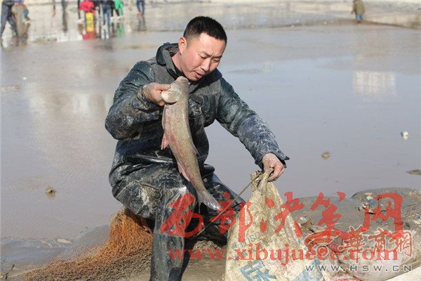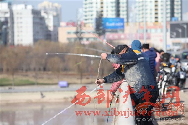 橋上釣魚(yú)人忙得不亦樂(lè)乎,橋下?lián)启~(yú)者也是爭(zhēng)先恐后。咸陽(yáng)湖橡膠壩附近,不少市民拎著袋子和塑料桶在石縫里尋找殘留的小魚(yú)。比起這些撿小魚(yú)的市民,橡膠壩下面水洼處的幾名捕魚(yú)人則要更專(zhuān)業(yè)一些,他們下到水里,用力將網(wǎng)甩出去,一網(wǎng)子下去最少也有10多條大魚(yú)。有些人沒(méi)有撈到魚(yú),便現(xiàn)場(chǎng)從捕魚(yú)人手里花上10元或20元,買(mǎi)上一條大魚(yú)心滿(mǎn)意足地回家去了。
