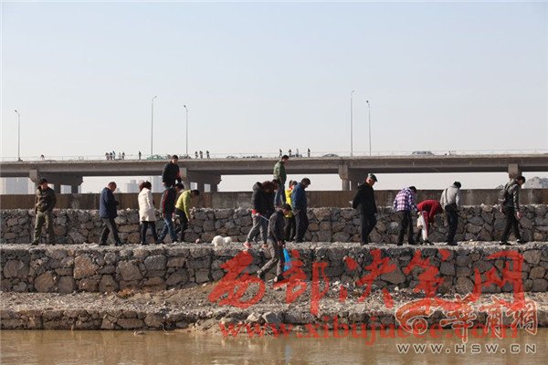 咸陽(yáng)湖橡膠壩附近,滿(mǎn)是捕魚(yú)和撈魚(yú)的人。