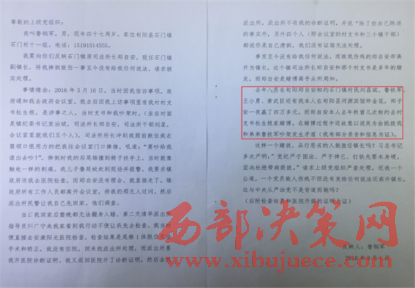 當(dāng)事人魯鋼軍于2016年3月16號(hào)在石門(mén)鎮(zhèn)政府會(huì)議室被傷,而致他受傷的當(dāng)事人鄭自安還升任石門(mén)鎮(zhèn)副鎮(zhèn)長(zhǎng),而這個(gè)新任鎮(zhèn)長(zhǎng)鄭自安就是上訪人向旬陽(yáng)縣委組織部實(shí)名舉報(bào)長(zhǎng)期聚賭的主要人物。而鄭自安賭博并非偶爾賭一兩次,而是長(zhǎng)期聚賭,鄭自安和上訪人魯鋼軍結(jié)怨就是在前幾年上訪人在上訪過(guò)程中認(rèn)識(shí)的。鄭自安讓上訪人介紹賭友認(rèn)識(shí)聚賭而對(duì)上訪人有怨氣。石門(mén)鎮(zhèn)難道是特區(qū)要以賭博產(chǎn)業(yè)為龍頭嗎?否則怎么會(huì)讓一個(gè)賭徒任鎮(zhèn)長(zhǎng)?2016年3月16日在鎮(zhèn)政府辦公室致使魯剛軍尾椎體滑脫,造成多日生活部分失去自理能力。就因種種事由,魯剛軍曾多次向旬陽(yáng)縣紀(jì)委、安康市組織部、安康市紀(jì)委反映,至今未得到妥善處理。