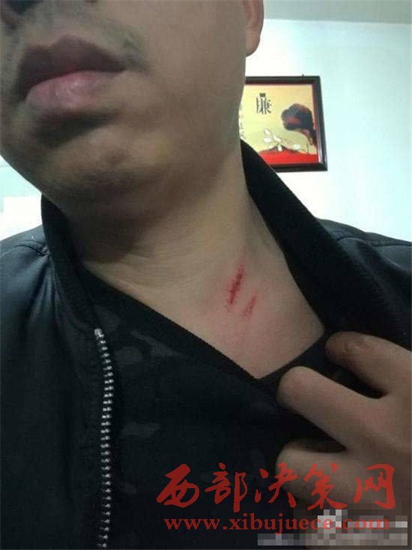 胡震稱雙方發(fā)生沖突,混亂中他的脖子被打傷。 胡震微博@臻善大乘