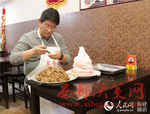 “我父親那一代,凌晨?jī)扇c(diǎn)就爬起來(lái)浸米,回去休息幾個(gè)小時(shí),五六點(diǎn)再起來(lái)用石磨磨米漿……”一說(shuō)起元宵,跟元宵打了一輩子交道的林英德就滔滔不絕,“肉呢也有講究,上等的豬腿肉,剔干凈筋、皮等雜質(zhì)后再調(diào)味。”
