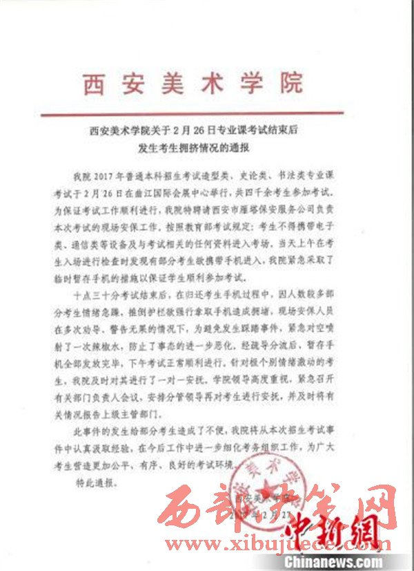 西安美術(shù)學(xué)院發(fā)布的事件通報稱,考試結(jié)束后,在歸還手機過程中,因人數(shù)較多部分考生情緒急躁,推倒護(hù)欄欲強行拿取手機造成擁堵,現(xiàn)場安保人員在多次勸導(dǎo)、警告無果的情況下,為避免發(fā)生踩踏時間,緊急對空噴射了一次辣椒水,防止了事態(tài)的進(jìn)一步惡化。經(jīng)疏導(dǎo)分流后,暫存手機全部發(fā)放完畢,下午考試順利進(jìn)行。針對個別情緒激動的考生,該院即使對其進(jìn)行了一對一安撫。學(xué)院領(lǐng)導(dǎo)高度重視,緊急召開有關(guān)部門負(fù)責(zé)人會議,安排分管領(lǐng)導(dǎo)再對考生進(jìn)行安撫,并及時將有關(guān)情況報告上級主管部門。此事件的發(fā)生給部分考生造成了不便,該院將從本次招生考試事件中認(rèn)真汲取經(jīng)驗,在今后工作中進(jìn)一步細(xì)化考務(wù)組織工作,為廣大考生營造更加公平、有序、良好的考試環(huán)境。