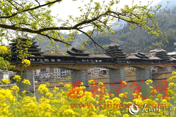春暖花開時(shí)節(jié),廣西龍勝各族自治縣民族風(fēng)雨橋旁的油菜花競(jìng)相綻放,風(fēng)雨橋在油菜花的點(diǎn)綴下美不勝收,形成了一道美麗的春天景致,充滿著濃郁的春天氣息,吸引眾多游客前來觀賞拍照。