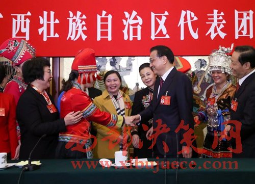 【李克強(qiáng)在廣西團(tuán)巧借“劉三姐”祝福全國(guó)女同胞】三八婦女節(jié)這天,李克強(qiáng)來(lái)到廣西代表團(tuán)參加審議報(bào)告。他首先祝在場(chǎng)的女代表及女同胞節(jié)日快樂(lè)??偫碚f(shuō):“廣西是劉三姐的家鄉(xiāng),她的歌聲至今余音繚繞,代表了女同胞美好的形象。我在這里向你們,并通過(guò)你們向全國(guó)女同胞致以節(jié)日的問(wèn)候和衷心的祝福。”