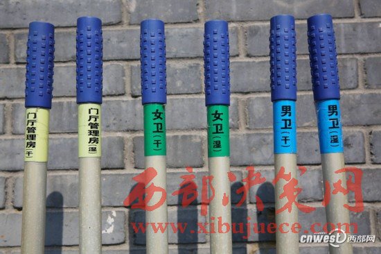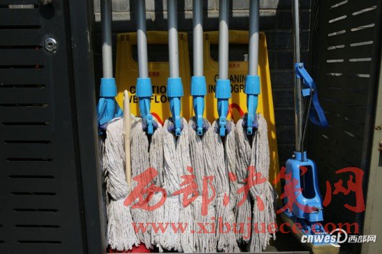 3月8日,西安環(huán)城公園一公廁門(mén)口的拖布柜里整整齊齊放著全套拖布,有男衛(wèi)、女衛(wèi)、門(mén)廳管理房專用的干濕拖布。