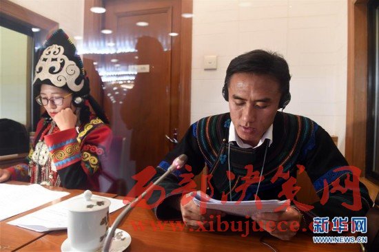 3月5日,民族語(yǔ)文翻譯組工作人員瓦其金強(qiáng)(右)在人民大會(huì)堂對(duì)十二屆全國(guó)人大五次會(huì)議開(kāi)幕會(huì)進(jìn)行同聲傳譯。