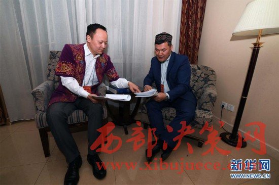 3月7日晚,民族語(yǔ)文翻譯組工作人員包烏爾江(左)和別爾克努爾在討論文件翻譯。