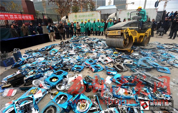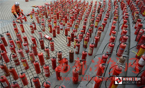 2012年11月6日,四川省成都市,一批假冒偽劣的消防滅火器被銷毀。當(dāng)日,四川省“119”消防宣傳周啟動暨消防產(chǎn)品形式安檢公開處理假冒偽劣消防器材產(chǎn)品集中銷毀儀式在成都舉行。