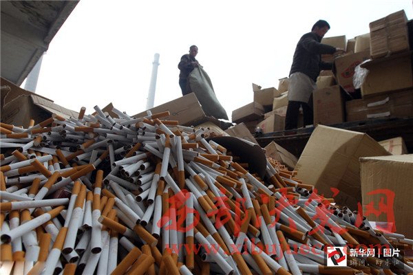 2015年3月13日,河南許昌,工作人員將假冒偽劣香煙傾倒在焚燒爐旁,準備用于燃燒發(fā)電。
