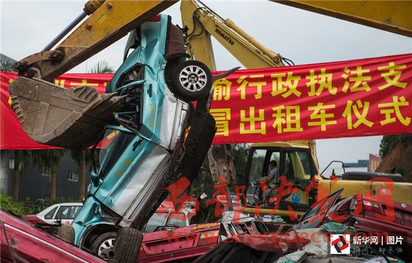 2016年6月16日上午,廣東深圳,深圳市交通運輸行政執(zhí)法支隊在觀瀾大富扣車場舉行公開銷毀假冒出租車儀式,對查扣的484輛假冒出租車依法、公開、集中進行銷毀。圖為銷毀現(xiàn)場,假“的士”在挖掘機的巨臂下變成廢鐵。