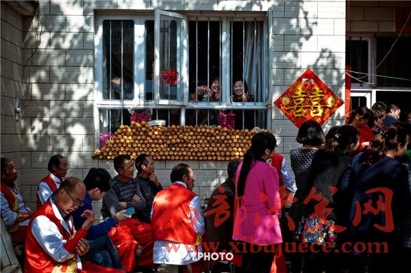新郎來接新娘時(shí),院子里擠滿了熱鬧的人群,閨房的窗臺(tái)上擺著今年剛收下的玉米。