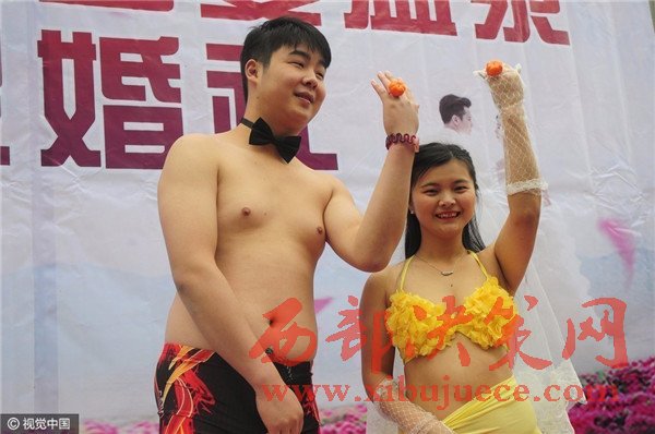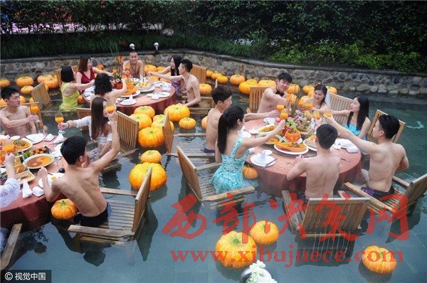 杭州現(xiàn)溫泉南瓜婚禮 新人賓客泳裝參加畫風(fēng)奇特