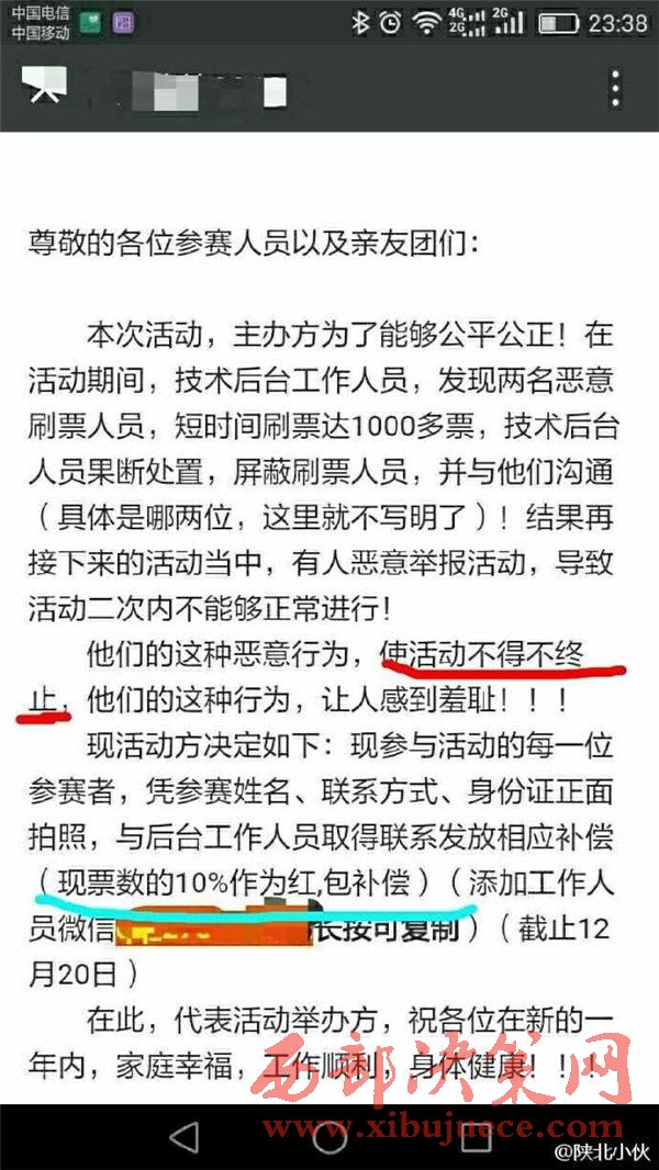 2016年12月初,榆林陽光汽貿(mào)通過某公眾號發(fā)起2016榆林陽光起亞杯“最美司機”評選活動,活動設置了豐厚了獎品作為獎勵。并組織全民參與評選活動的投票行為。至此,在榆林眾多市民的朋友圈都發(fā)起了轉發(fā)拉票行為。然而,此次拉票行為卻不斷變更投票時間和決賽時間。近日,某公眾號發(fā)布信息,聲稱陽光汽貿(mào)組織的“最美司機”活動取消,并給予相應的票數(shù)補償。此行為卻引起眾多市民的質(zhì)疑,認為陽光汽貿(mào)是在“消遣”參與投票的近萬名市民,從而變相成廣告推銷行為。究竟陽光汽貿(mào)是心疼評選活動的獎品發(fā)放,還是一種涉嫌商業(yè)的欺詐行為,請@榆林工商 ,根據(jù)《消費者權益保護法》予以重查重處。