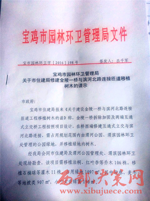 寶雞市人民政府副市長(zhǎng)王琳于2017年1月4日做出了批復(fù):“擬同意市園林環(huán)衛(wèi)局意見,建議由市住建局做好涉及苗木移植,市園林環(huán)衛(wèi)局做好移植監(jiān)督檢查和技術(shù)把關(guān),確保樹木成活”。