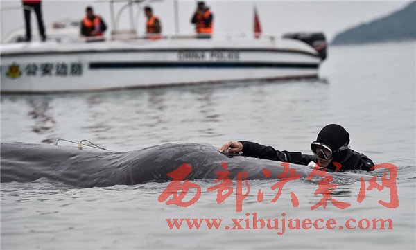 3月14日,在惠州港油庫碼頭附近海域,潛水員在抹香鯨身上安裝儀器對其進行聽覺測試,判斷其健康狀況。