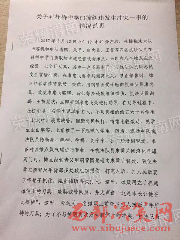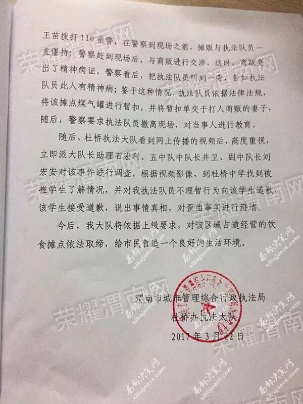 當(dāng)晚6點(diǎn)以后,涉事執(zhí)法隊(duì)員所屬執(zhí)法大隊(duì)杜橋執(zhí)法大隊(duì)書(shū)面回復(fù)便在網(wǎng)絡(luò)中被網(wǎng)友們不斷的轉(zhuǎn)載。據(jù)該回復(fù)稱(chēng):2017年3月22日中午12時(shí)40分左右,杜橋執(zhí)法大隊(duì)市容機(jī)動(dòng)中隊(duì)謝鵬、朱勇、康忠民、王苗等4名執(zhí)法隊(duì)員在杜橋中學(xué)門(mén)前取締占道經(jīng)營(yíng)飲食攤點(diǎn),當(dāng)時(shí)有八個(gè)攤點(diǎn)在此經(jīng)營(yíng),七個(gè)已勸離,其中一戶(hù)不愿離開(kāi),與執(zhí)法隊(duì)員康忠民發(fā)生言語(yǔ)沖突,在康忠民要求其搬離此處,禁止銷(xiāo)售時(shí),攤點(diǎn)經(jīng)營(yíng)者情緒激動(dòng),突然,用鋼管圓凳子砸向執(zhí)法隊(duì)員康忠民,致使康忠民胳膊、背部等多處軟組織損傷,執(zhí)法隊(duì)員謝鵬、王苗等見(jiàn)狀,立即趕到康忠民處進(jìn)行勸導(dǎo),在勸導(dǎo)過(guò)程中,杜橋中學(xué)一名學(xué)生說(shuō)城管打人,不明真相的約五六十名學(xué)生一起起哄、謾罵城管,因康忠民被打,情緒比較激動(dòng),見(jiàn)學(xué)生歪曲事實(shí),上前推了一下起哄的學(xué)生,隨后,機(jī)動(dòng)中隊(duì)執(zhí)法隊(duì)員朱勇、陳新亮、魏楠、徐嬌、姜寧寧、孫偉珍趕到現(xiàn)場(chǎng),準(zhǔn)備對(duì)該攤點(diǎn)煤氣罐進(jìn)行暫扣,在執(zhí)法隊(duì)員朱勇關(guān)閉液化氣罐閥門(mén)時(shí),攤點(diǎn)經(jīng)營(yíng)者用鋼管圓凳砸向朱勇手臂處,致使朱勇左前臂及手背部多處軟組織損傷,打完人后,打人攤販妻子將凳子抓住,阻止攤販再次打人,這時(shí),攤販用左手抓起攤位上的刀具,威脅城管隊(duì)員,并大聲說(shuō)“這是市長(zhǎng)讓他在此擺攤”,這時(shí),旁邊另一名攤販上前奪取打人攤販左手所持的刀具;為了不與攤販再次發(fā)生肢體上的沖突,執(zhí)法隊(duì)員王苗撥打110報(bào)警,在警察到現(xiàn)場(chǎng)之前,攤販與執(zhí)法隊(duì)員一直僵持;警察趕到現(xiàn)場(chǎng)后,與商販進(jìn)行交涉,這時(shí),商販亮出了精神病證,警察看后,把執(zhí)法隊(duì)員叫到一旁,告知執(zhí)法隊(duì)員此人有精神病;鑒于這種情況,執(zhí)法隊(duì)員依據(jù)法律法規(guī),將該攤點(diǎn)煤氣罐進(jìn)行暫扣,并將暫扣單交于打人商販的妻子,隨后,警察要求執(zhí)法隊(duì)員撤離現(xiàn)場(chǎng),對(duì)當(dāng)事人進(jìn)行教育。