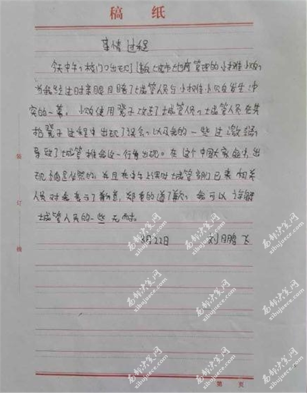 同時(shí),該回復(fù)還出現(xiàn)了學(xué)生和兩名執(zhí)法人員面對(duì)面的照片,在回復(fù)的最后有該學(xué)生手寫(xiě)的事情過(guò)程。據(jù)該學(xué)生手寫(xiě)過(guò)程稱(chēng),當(dāng)時(shí)學(xué)生親眼目睹了城管與小販發(fā)生沖突的一幕,既然是親眼目睹,為何會(huì)有視頻中的“隨便打人”一說(shuō)嗎?可想而知孩子在寫(xiě)這份事情過(guò)程的時(shí)候是什么樣的心情。