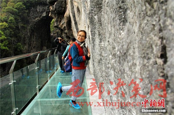 3月24日,地處廣西融安縣石門仙湖景區(qū)的玻璃棧道試運(yùn)行,數(shù)十名游客體驗(yàn)“嘗鮮”。該玻璃棧道建在距離谷底達(dá)60米的懸崖壁上,下方是石門仙湖山石峻峭的中天坑,全長(zhǎng)309.4米、寬1.6米,是目前廣西最長(zhǎng)的玻璃棧道。