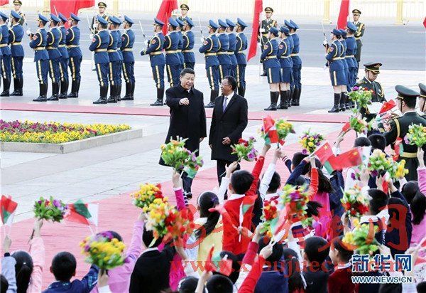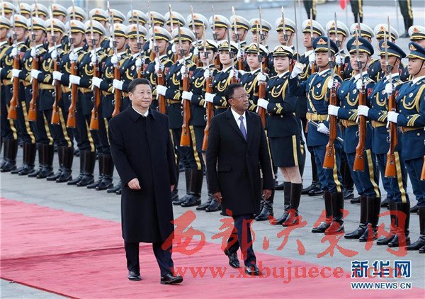 3月27日,國家主席習近平在北京人民大會堂同馬達加斯加總統(tǒng)埃里舉行會談。這是會談前,習近平在人民大會堂東門外廣場為埃里舉行歡迎儀式。