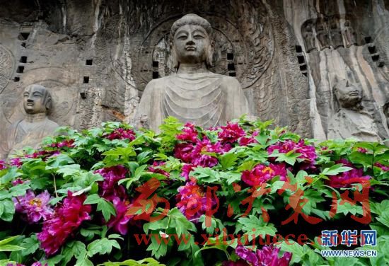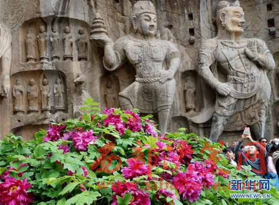 目前正值洛陽牡丹的盛花期,洛陽龍門石窟景區(qū)內(nèi)的近萬株牡丹爭奇斗艷,與古老的石刻佛像共同構(gòu)成獨(dú)特的風(fēng)景。