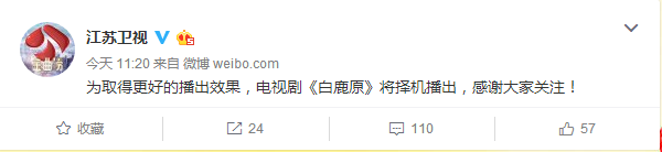 很多守在電視機前準(zhǔn)備看《白鹿原》的觀眾都撲空了,江蘇衛(wèi)視和安徽衛(wèi)視原計劃播放第2集的時間卻各自播放了其他內(nèi)容,但兩方都未對《白鹿原》停播作出解釋。就在今日,兩家衛(wèi)視都官方發(fā)表聲明表示,“為取得更好的播出效果,電視劇《白鹿原》將擇機播出,感謝大家關(guān)注!”