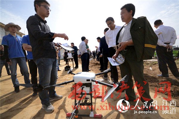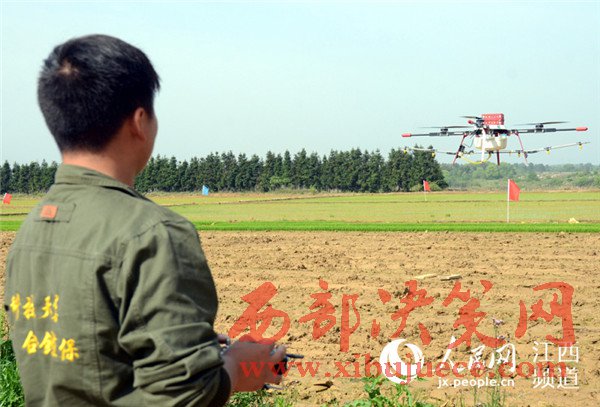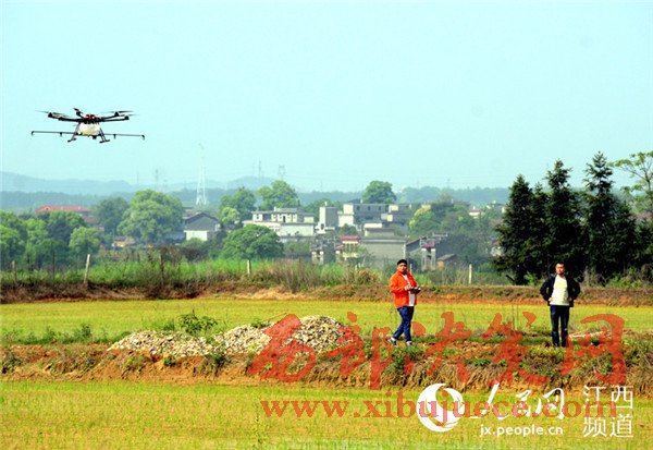 4月18日,江西省奉新縣宋埠鎮(zhèn)橋頭村奉新縣建華農機合作社的稻田上空,數(shù)架無人機正在“嗡嗡”作業(yè),農技員正在展示植保無人機噴灑農藥的功能。