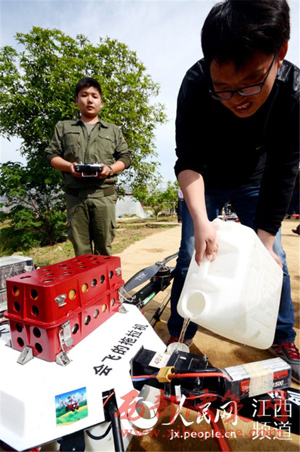 “飛手”正在給無人機搭載的藥箱內灌裝農藥